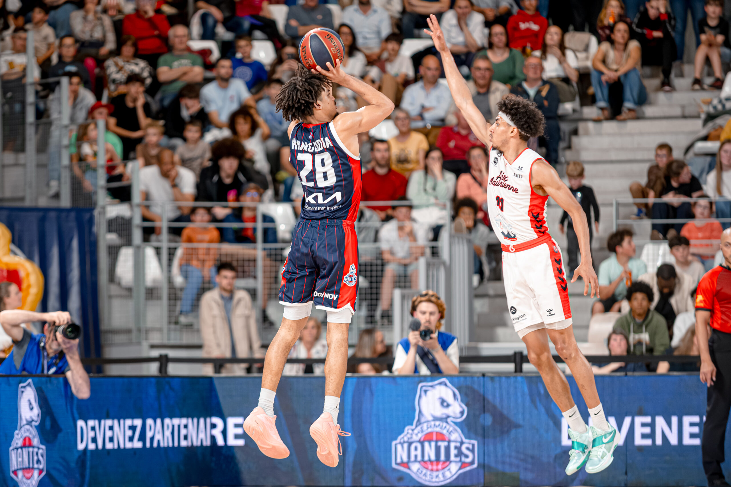 Emmené par Valentin Vitale-Boiteux, c’est bien Aix-Maurienne qui démarrait le mieux cette rencontre en se montrant adroit (67 % de réussite dans le 1er quart-temps) pour prendre ainsi l’avantage au tableau d’affichage (8-13). Rémy Valin prenait alors son premier temps-mort pour essayer de réveiller ses joueurs défensivement. Mais Kamel Ammour se mettait en évidence et donnait 8 points d’avance aux Savoyards (10-18). Les rotations nantaises permettaient de recoller à 2 points des visiteurs (21-23) sur un 2+1 signé Bubu Palo. Mais Aix-Maurienne finissait fort ce 1er quart-temps pour reprendre 8 points d’avance (22-30) après les 10 premières minutes.