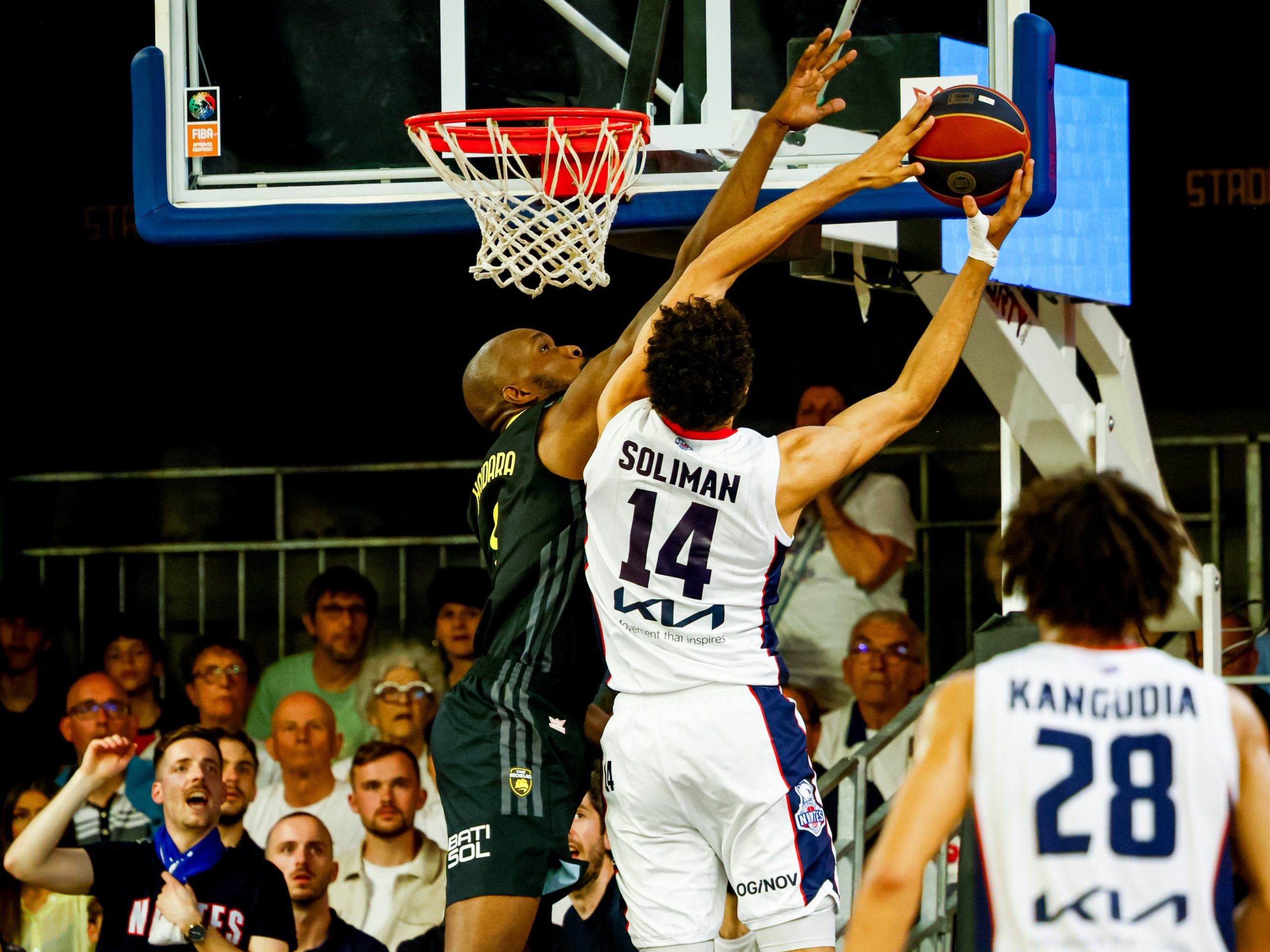 Q3 22/21 : Ce sont cependant les maritimes qui reprennent la main en ce début de troisième période, avec de nouveau à la manœuvre Jérôme SANCHEZ et Tyler THOMAS très en réussite dans ses tirs (62/56-24ème). C’est le moment que choisit Nathan SOLIMAN pour laisser libre cours à son jeune talent, en inscrivant 8 Points consécutifs agrémentés d’actions défensives décisives. KANGUDIA remet le couvert à 3 Pts et c’est de nouveau une égalité parfaite (69/69-28ème). Les locaux conservent un tout petit avantage après trente minutes de jeu (72/71).