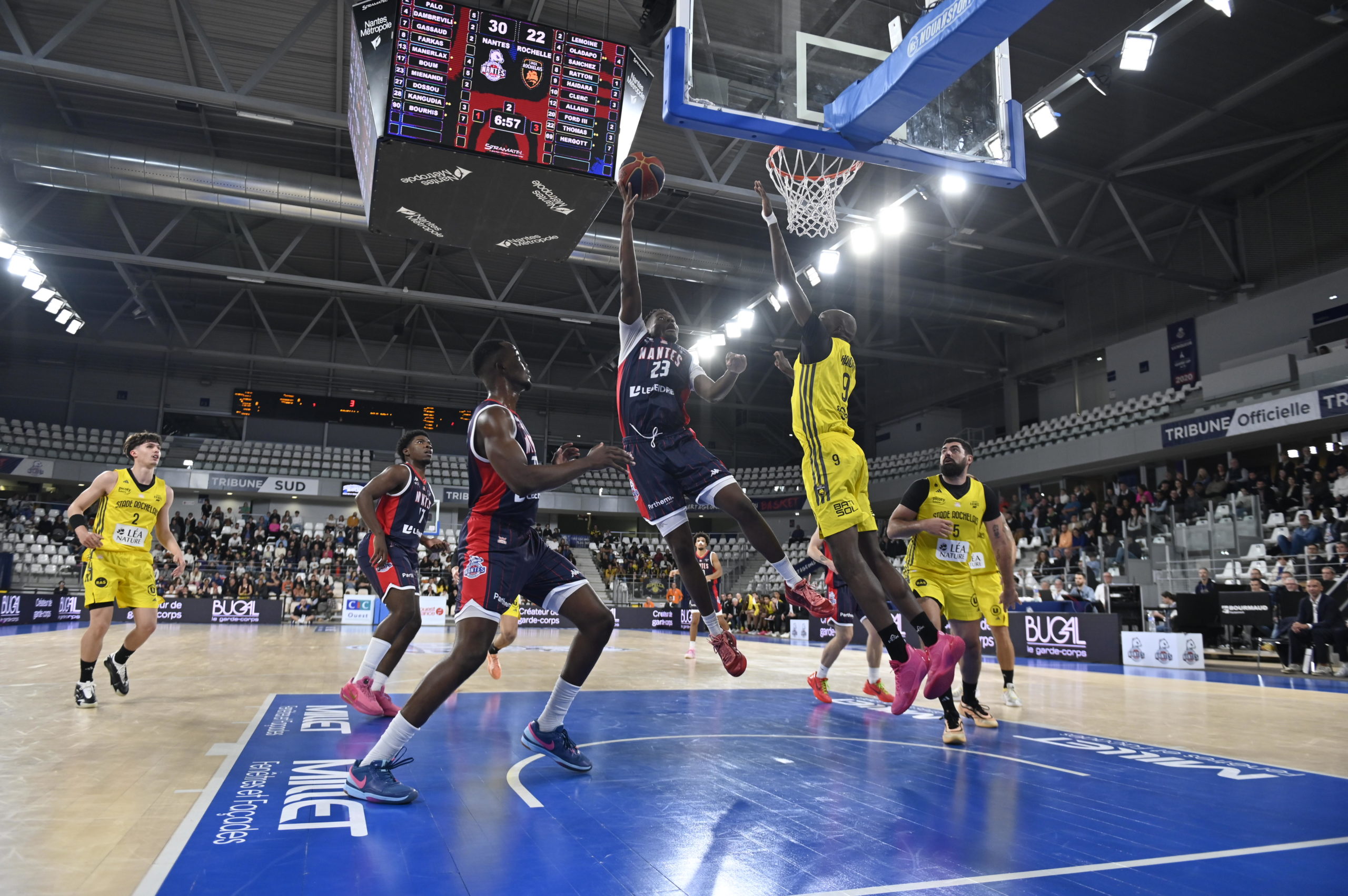 Le NBH poursuivait sa course en tête lors des premières minutes de la 2ème période avec un bon apport de Raphaël Boum et toujours l’adresse de Lucas Bourhis (35-30). Mais La Rochelle restait au contact avec notamment un efficace Lucas Hergott et parvenait à égaliser (37-37) grâce aux efforts de l’ancien nantais Cherif Haidara. Les Rochelais reprenaient même l’avantage dans la foulée (37-40) sur une réussite primée de Robert Ford III. La nouvelle recrue nantaise, Bubu Palo, l’imitait quelques instants plus tard et, à la pause, les 2 formations étaient dos à dos (42 partout).